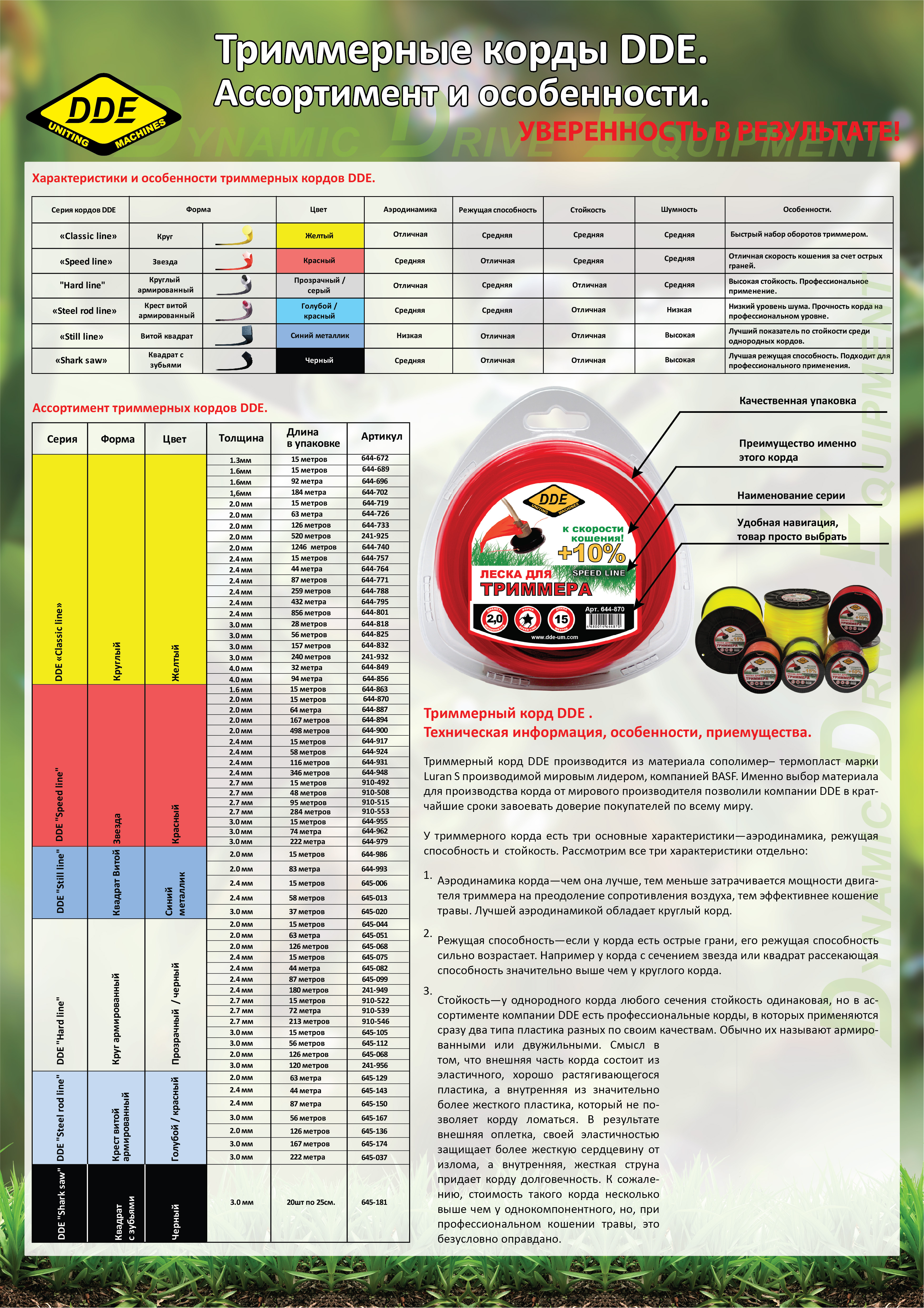 Триммерный корд DDE производится из материала сополимер-термопласт марки Luran S производимой мировым лидером, компанией BASF. Именно выбор материала для производства корда от мирового производителя позволили компании DDE в кратчайшие сроки зовоевать доверие покупателей по всему миру.